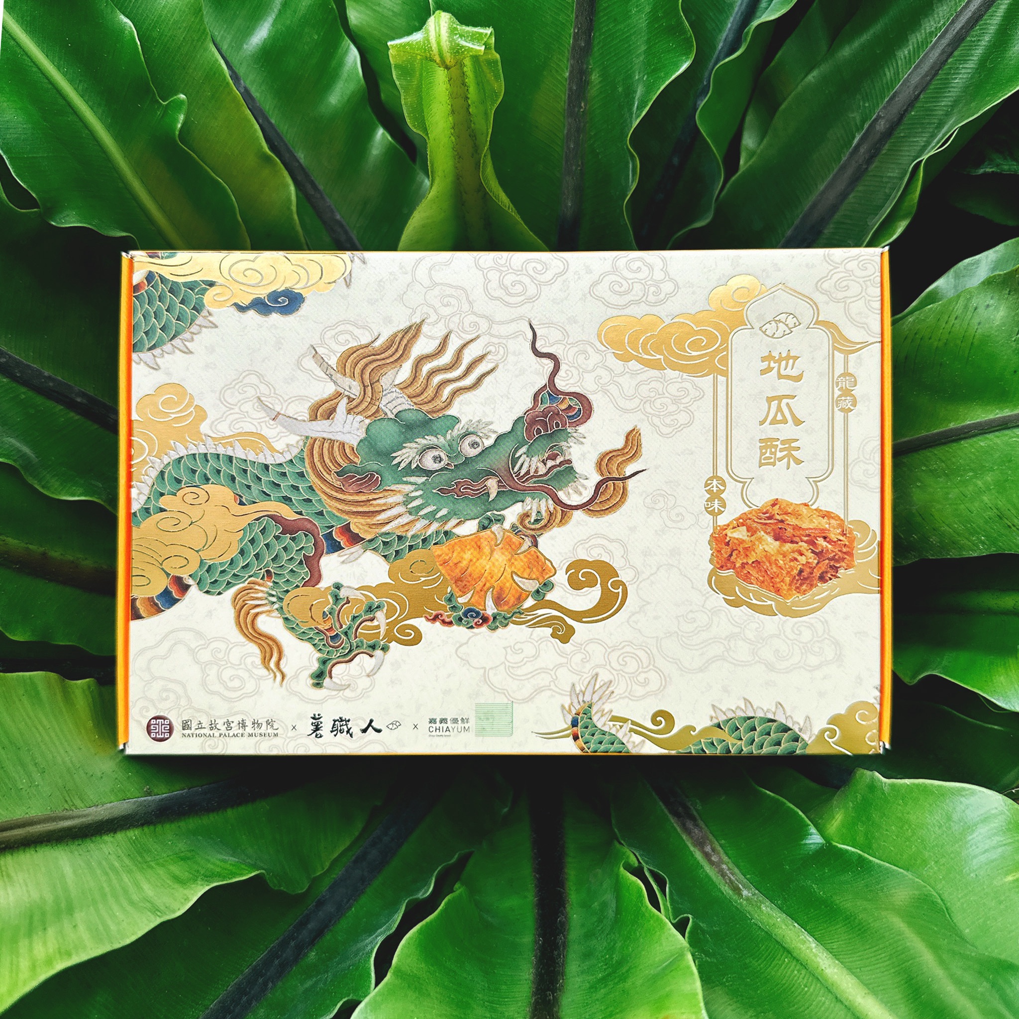 【龍藏本味】原味地瓜酥故宮典藏 × 台灣味 - 聯名禮盒讓我們從「故宮典藏 × 台灣味」的對話出發, 以《明孝宗坐像軸》與龍袍紋飾為靈感來源。 畫面中,龍爪輕托地瓜酥,象徵御品級的甜香與祥瑞。 整體以龍袍上的金龍、雲紋與綠鱗為主視覺, 將皇者服飾的莊嚴氣度,化為包裝的文化符號。 在傳統與創新的交會間,「薯職人」以台灣味延續經典。